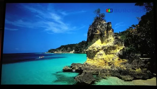 Hier auch noch einmal ein Vergleichsfoto zwischen dem Optoma (oben) und einem JVC X35 Beamer mit einem Burosch Referenzbild.