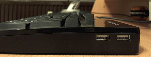 Die Tastatur hat einen USB 2.0 Hub, den über einen zweiten USB-Stecker am Ende des Kabels mit dem Rechner verbunden wird. So kann man den Hub auch dann nutzen, wenn die Tastatur am PS/2 Port angeschlossen ist. Warum der Hub nicht drei oder vier Anschlüsse mit bringt? Nun, Das dürfte wohl eine Frage des Platzbedarfs der USB Anschlüsse sein. Ein USB 3.0 Hub währe vielleicht noch schöner gewesen, doch Gelegenheitstäter wie mich ist der PS/2 Port absolut ausreichend, weil ich üblicher Weise ohnehin nur kleine Dateien per USB-Stick kopiere. (PDF- und Textdateien, Bilder, etc.)