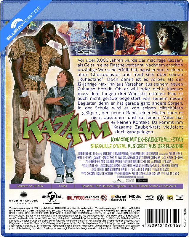 Der mächtige Geist Kazaam (S. O'Neal) hat schon zahlreiche Wünsche erfüllt, als er vor über 3.000 Jahren in eine Flasche verbannt wurde und seitdem seinen Ruhestand genießt. Inzwischen befindet er sich in einem Ghettoblaster, aus dem er versehentlich von dem 12-jährigen Max (F. Capra) befreit wird. Nun muss Kazaam wieder seiner Berufung nachgehen und seinem neuen Meister drei Wünsche erfüllen. Kazaam, der seinen Ruhestand sehr genossen hat, ist hiervon wenig begeistert. Aber auch Max hat derzeit ganz andere Sorgen, als sich Gedanken um seinen neuen unfreiwilligen Begleiter zu machen. Möglicherweise könnte ihm aber gerade Kazaam helfen, seine Sorgen zu lösen, denn Max wird in der Schule von Mitschülern geärgert, kann den neuen Mann seiner Mutter nicht ausstehen und hat zu seinem leiblichen Vater keinen Kontakt. Wird ihm Kazaam helfen können? Kazaam - Der Geist aus der Flasche Blu-ray Preisvergleich