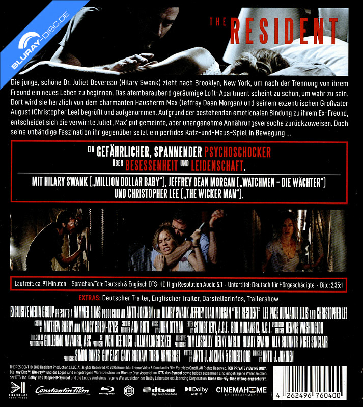 Die junge, wunderhübsche Ärztin Juliet Dermer (H. Swank) hat sich kürzlich von ihrem Ehemann getrennt und zieht nun in ein schönes, geräumiges Apartment in Brooklyn. Hier will sie ein ganz neues Leben anfangen. Während kurz nach dem Einzug noch die Begeisterung für das Apartment groß ist, schwindet die Euphorie, als Juliet immer mehr das Gefühl bekommt, in ihren vier Wänden nicht alleine zu sein. Es stellt sich heraus, dass Max (J.D. Morgan), der Eigentümer des Apartments, ein Stalker ist und eine gefährliche Gier nach Juliet entwickelt hat. Es beginnt ein schreckliches Katz-und-Maus-Spiel ... The Resident (2011) (Neuauflage) Blu-ray Preisvergleich