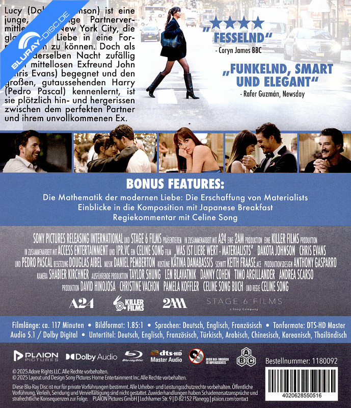 Lucy (D. Johnson) arbeitet als Partnervermittlerin in New York bei einer Firma mit dem Namen "Adore". Ihre Fachkenntnis ist so gefragt, dass ihre Kundinnen und Kunden bereit sind, auch etwas mehr zu bezahlen. Eines Tages lernt Lucy während ihrer Arbeit den charismatischen Broker Harry Castillo (P. Pascal) kennen, der in nahezu allen Bereichen perfekt zu sein scheint. Sie findet Gefallen an dem wohlhabenden Mann, obwohl sie weiterhin Gefühle für ihren Ex-Freund John (C. Evans) hegt, der als Schauspieler durchstarten will, sein Geld aber als Teilzeitkellner verdient. Immer mehr wirkt sich Lucys kompliziertes Gefühlsleben auch auf ihren Job aus … Was ist Liebe wert - Materialists Blu-ray Preisvergleich