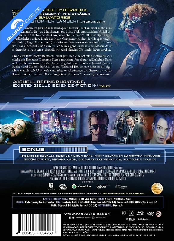 In einer nahen Zukunft steht das revolutionäre Computerspiel "Nirvana" kurz vor seiner Veröffentlichung. Aufgrund eines Computervirus allerdings hat der Protagonist des Games ein eigenes Bewusstsein entwickelt. Da er nicht in diesem konstruierten und sich wiederholenden Spieleuniversum sein Dasein fristen möchte, bittet er Programmierer Jimi Dini (C. Lambert) darum, die Software zu löschen. Dafür dringt Jimi in das geschützte Netzwerk des einflussreichen Konzerns Okosama Starr ein. Mit der Hilfe von abgetakelten Hackern begibt er sich auf die Reise durch eine dystopische Fantasiewelt, infolgedessen er bald nicht mehr zwischen der realen Welt und der digitalen unterscheiden kann … Nirvana - Die Zukunft ist ein Spiel (Limited Mediabook Edition) (Blu-ray + DVD) Blu-ray Preisvergleich