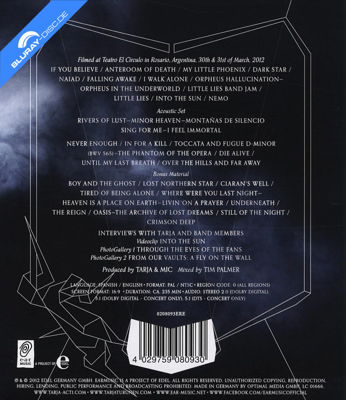 Die Finnin Tarja Turunen zählt zu den größten Heavy-Metal-Sopranisten der Welt und begeisterte schon unzählige Menschen auf der ganzen Welt. Mit dieser High-Definition Blu-ray Disc Veröffentlichung können Sie Tarja nun auch zu Haus bei einem ihrer sensationellen Auftritte erleben.Trackliste: