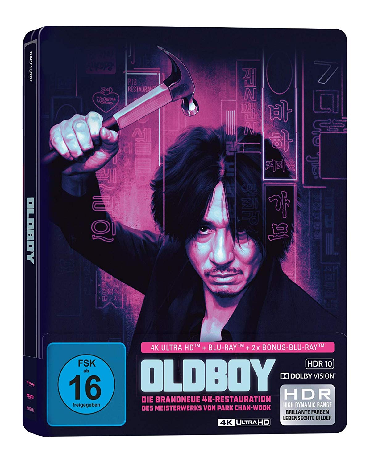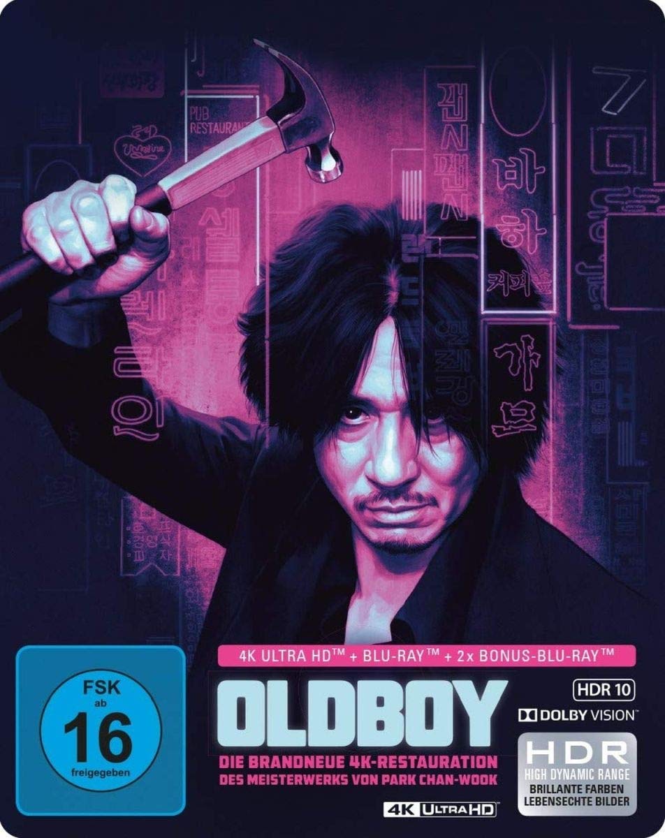 Am 22. November 2019 wird Capelight Pictures Chan-wook Parks Kultfilm "Oldboy" (Südkorea 2003) erstmals in 4K auf Ultra HD Blu-ray als limitierte Steelbook-Edition im Vertrieb der Al!ve AG veröffentlichen (siehe News). Die 4K-Umsetzung wurde brandneu restauriert und kommt mit HDR 10 und Dolby Vision. Laut Capelights Facebookseite wird das Steelbook ihr erstes mit "Glow in the Dark"-Effekt sein und "einen Quarterslip aus festem Karton" haben. Wie wir bereits berichtet haben, erscheint die Edition inklusive Blu-ray-Fassung und Bonus-Blu-ray. Die Extras bestehen u. a. aus einem Making-of, einem Videotagebuch, Interviews, entfallene Szenen uvm. Der deutsche Sound erklingt in DTS-HD Master Audio 5.1.