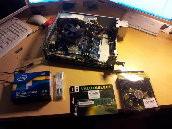 Neuer 2GB Ram Riegel (was ich mir eigentlich hätte sparen können, doch dazu später mehr), 60GB SSD von Intel, 120mm Lpfter für die CPU damit Ruhe ist.
