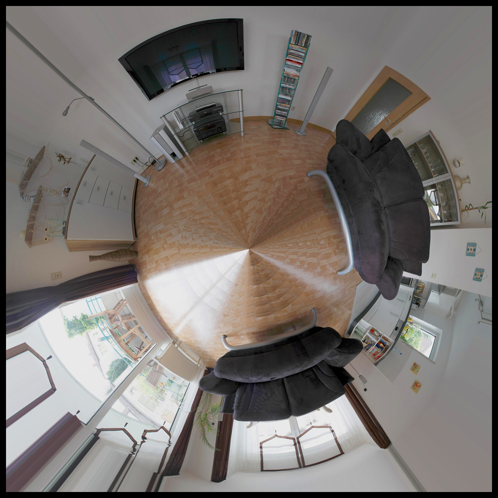 das 360er Foto ist aus 38 EInzelfotos entstanden. ANschließend ein normales Panorama gemacht. Danach in Photoshop die Breite des Fotos auf die Höhe gesetzt, somit verzertt. Anschließend um 180° gedreht und dann mittels Polarkoordinaten Filter von rechteckig nach Polar gewandelt.