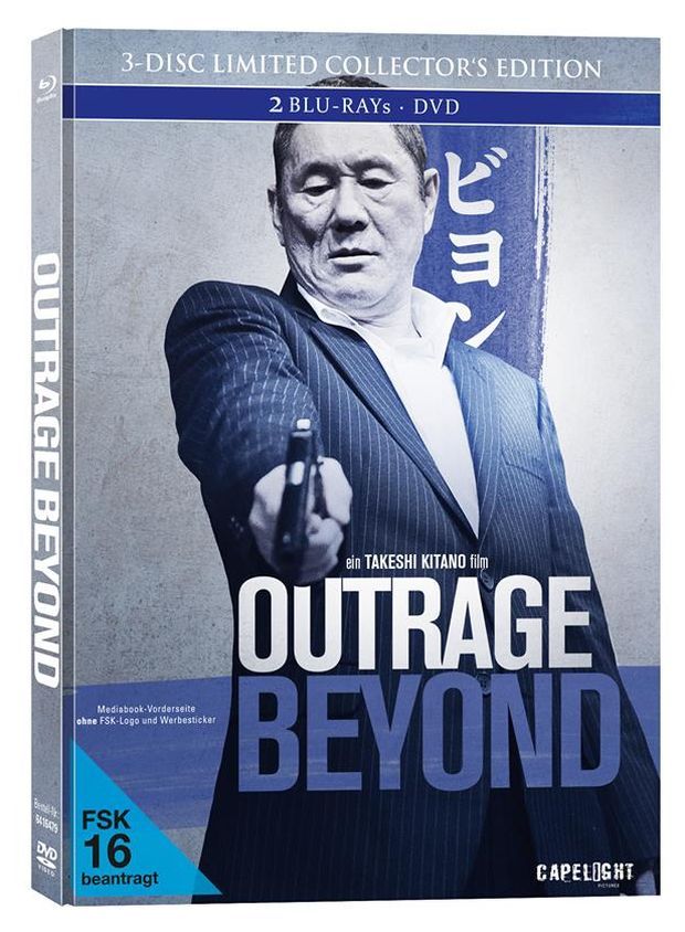 Am 27. Mai 2016 erscheint "Outrage Beyond" im limitierten 3-Disc-Mediabook (zwei Blu-rays und eine DVD). Bezüglich der Sonderausstattung sind noch nicht alle Details klar, sicher ist aber, dass die Edition auch mit einem Bonusfilm ausgestattet sein wird: "Achilles und die Schildkröte", ebenfalls von Takeshi Kitano inszeniert. Der Film feierte am 20. September 2008 seine Premiere in Tokio und läuft rund zwei Stunden.
