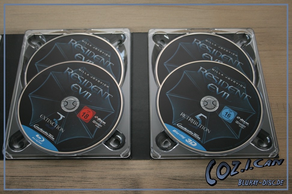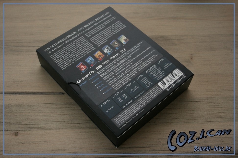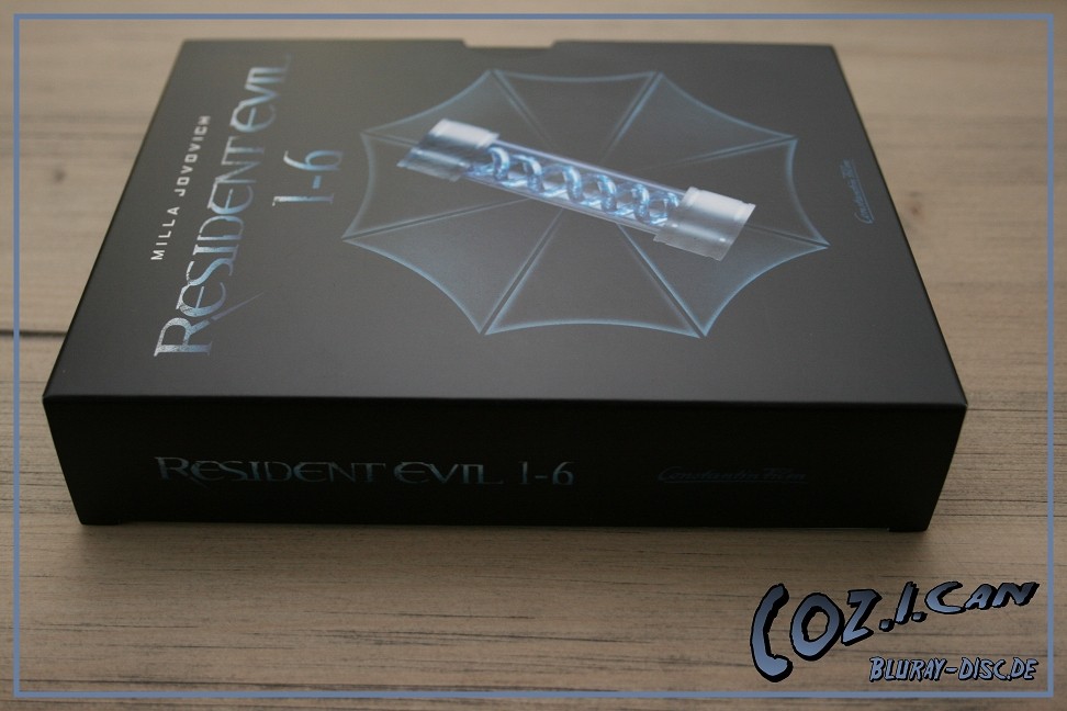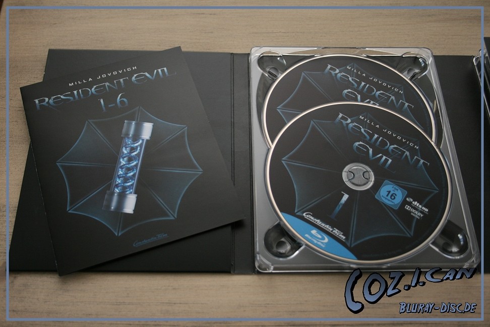 Es beinhaltet alle 6 Filme, wobei Teil 4 bis 6 in 3D vorliegen. Außerdem ist ein kleines Booklet dabei und das T-Virus Gefäß auf der Vorderseite des Schubers ist in Hochglanz.