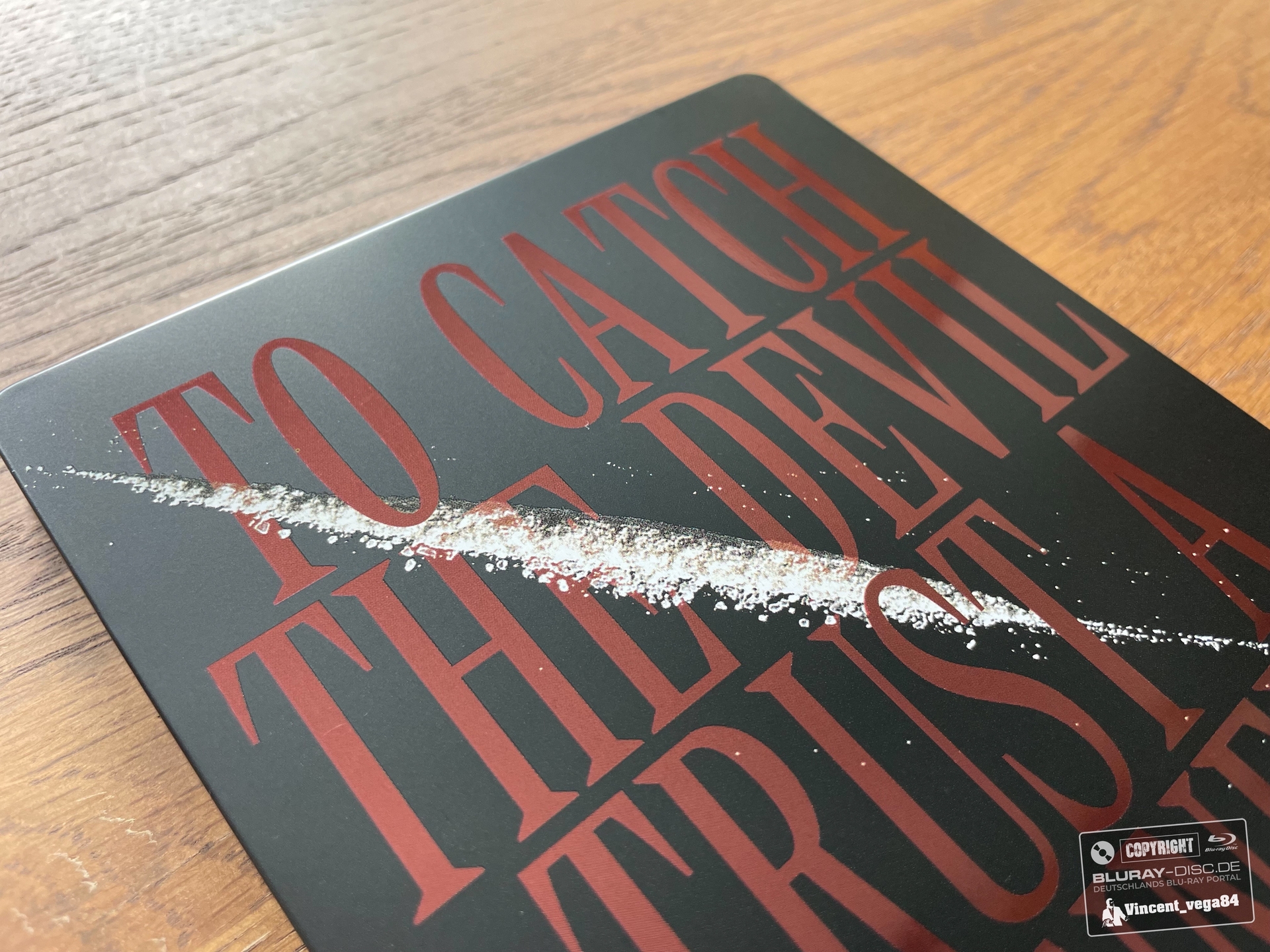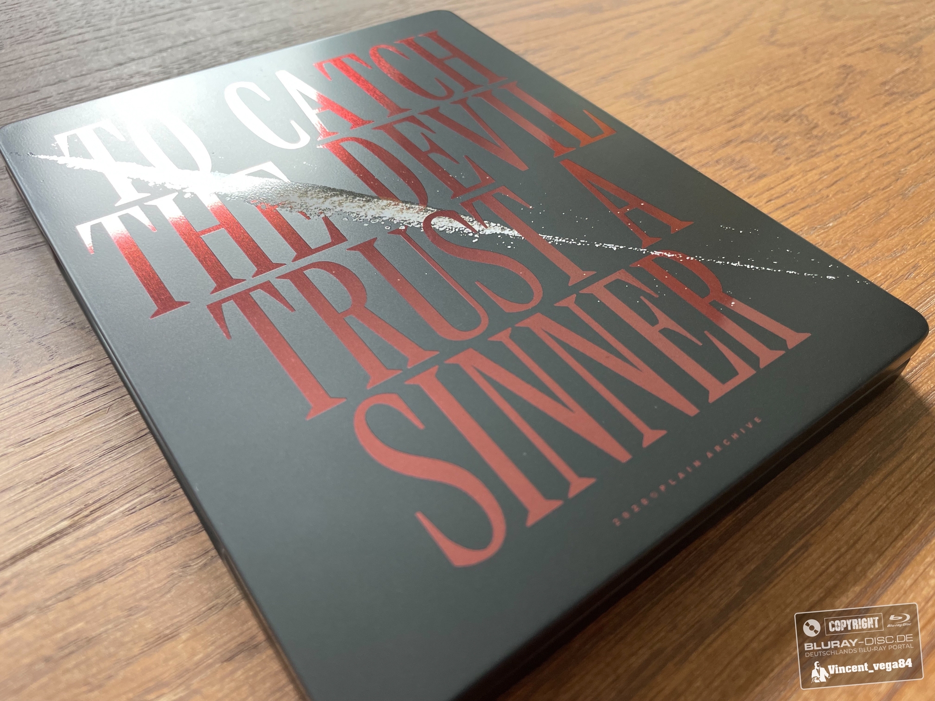 Die Heißfolierung der Tagline "To Catch the Devil Trust a Sinner"
