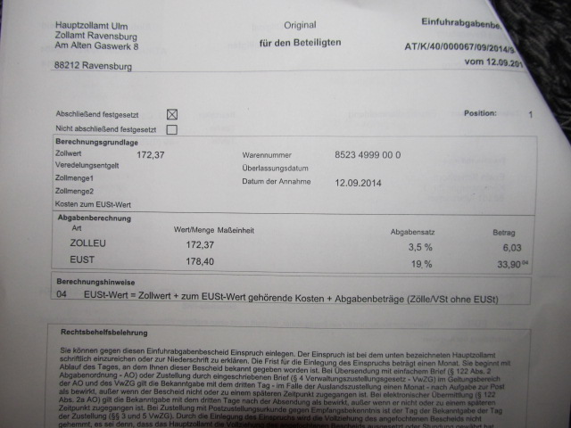 andere durfte ich beim Zoll abholen.