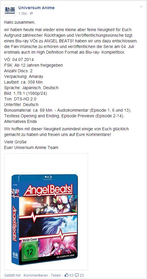 Laut Facebook wird Universum Anime Angel Beats am 04.07. auf BR