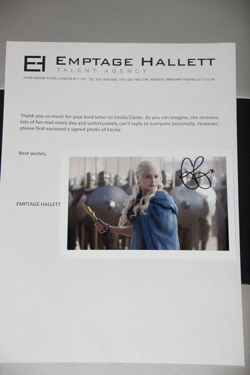 Ich bekam heute auch mal wieder Post. Hatte irgendwann im Sommer letzten Jahres mal zwei Fotos von Emilia Clarke direkt zu den Dreharbeiten von Game of Thrones nach England zum signieren geschickt. Heute kam Post von ihrer Agentur zurück mit einem Schreiben und der Info dass sie aufgrund der Menge an Fanpost leider nicht alles persönlich beantworten kann. Anbei war aber ein vorsigniertes Foto. Kein Print, sondern wirklich handgeschrieben.
