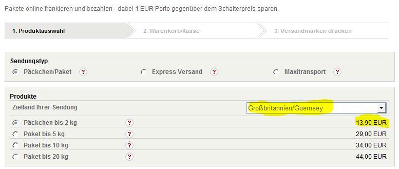 Der Versand für ein Päckchen nach Großbritannien/Guernsey (dort