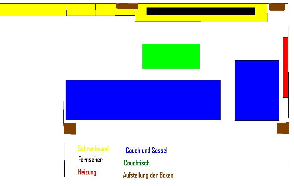 Zur Erklärung, die Frontlautsprecher kämen an die Wand links und
