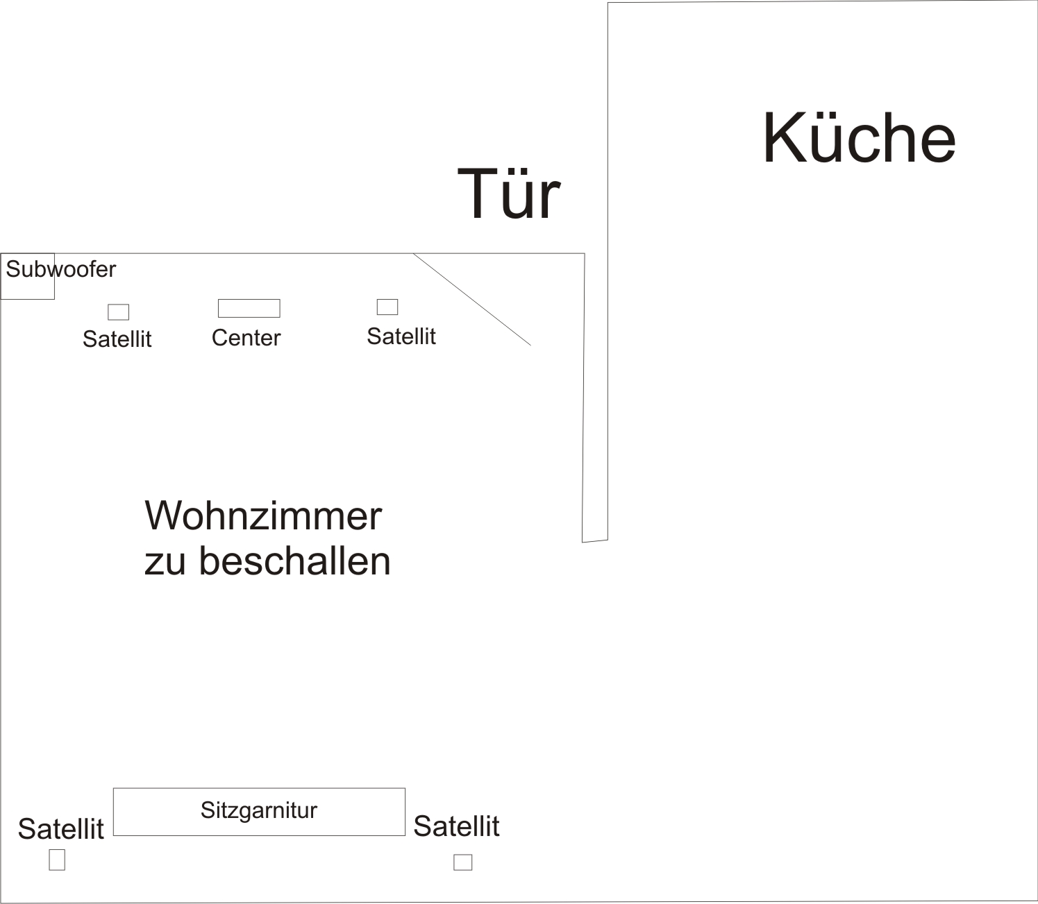 Der Raum ist ca. 45M² groß allerdings sind nur ca. 18m² zu beschallen. Siehe Bild im Anhang.