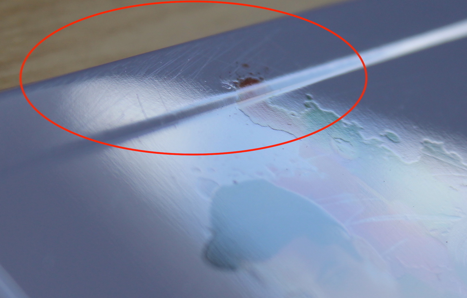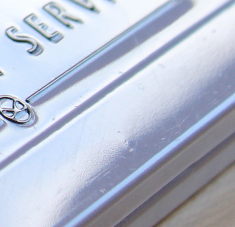 einen haarfeine Schleifspuren, zum anderen eine Delle. Wäre das das